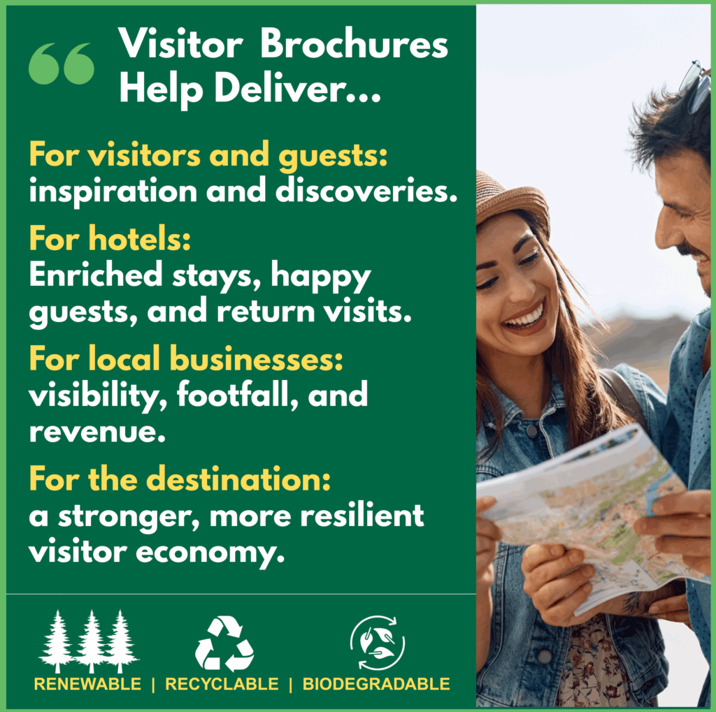 As professionals in tourism and hospitality, you know visibility is everything. Visitors cannot choose what they do not see. Yet one of the most effective and sustainable ways of being seen—printed brochures, guides, and maps—is being undermined by some. Digital is too often promoted as the “green” alternative, while the truth is the very opposite.