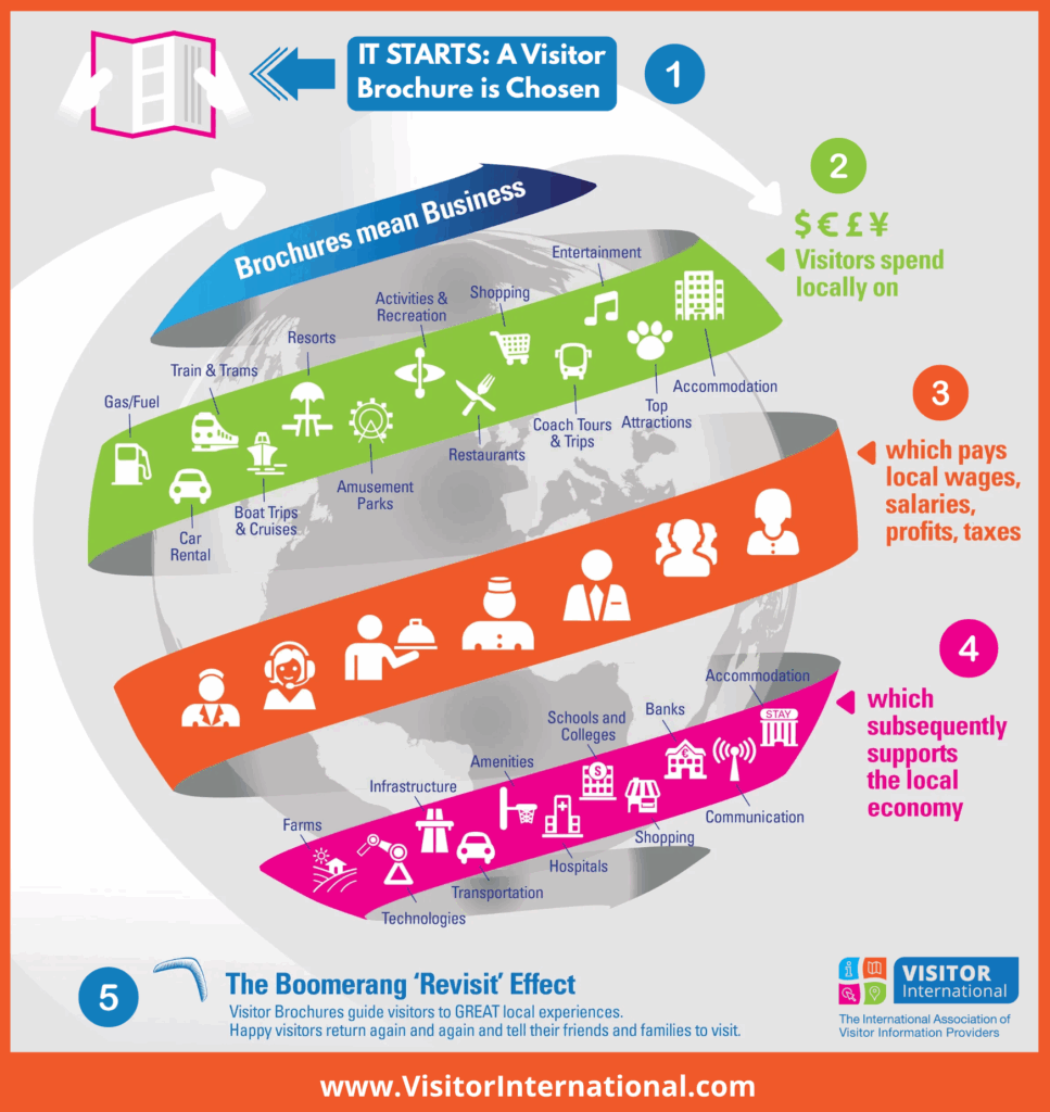 As shown in the globe infographic opposite that small act sets off a far-reaching economic journey. Follow the color-coded spiral across the globe and you’ll see how brochures influence what visitors choose to do, where they spend their money, and how that spending supports wages, communities, and long-term local growth.